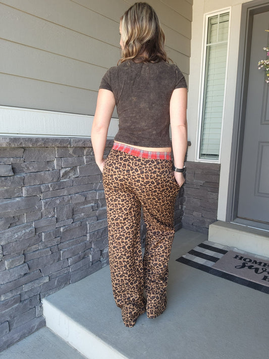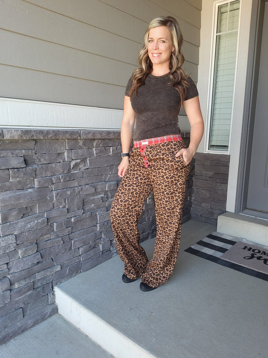 Plaid Flannel Contrast Waistband Leopard Pants (Leopard)