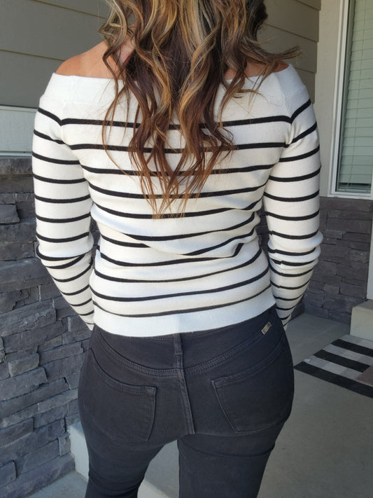 Striped Off the Shoulder Long Sleeved Knit Top (IVORY)