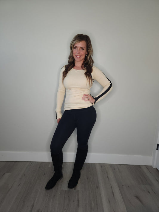 Striped Off the Shoulder Long Sleeved Knit Top (IVORY)